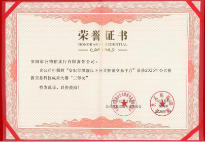 2025年是公共资源交易高质量发展深化推进、科技赋能创新突破的一年。在安阳市公共资源交易中心的正确指导下,我们锐意进取、不断创新,建成安阳市限额以下公共资源交易平台。该平台于2026年1月25日在北京召开的公共资源交易高质量发展大会暨科技成果大赛上荣获大赛三等奖,负责人刘松同志获评公共资源交易业务能手荣誉称号。